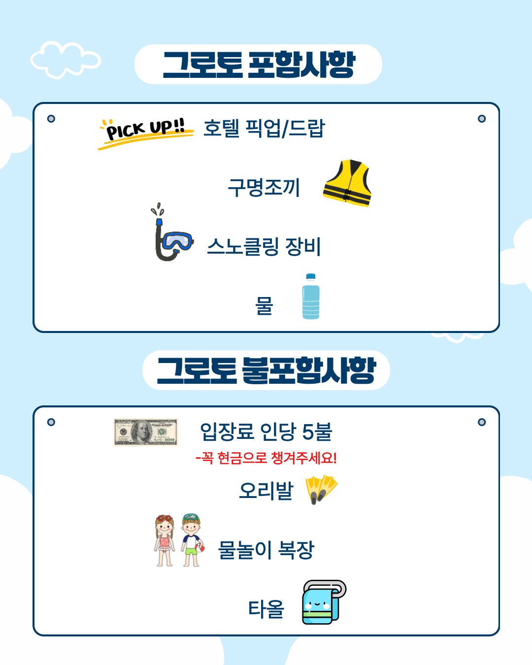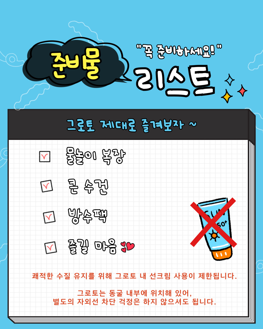 - 준비물: 수영복, 수건, 방수팩
