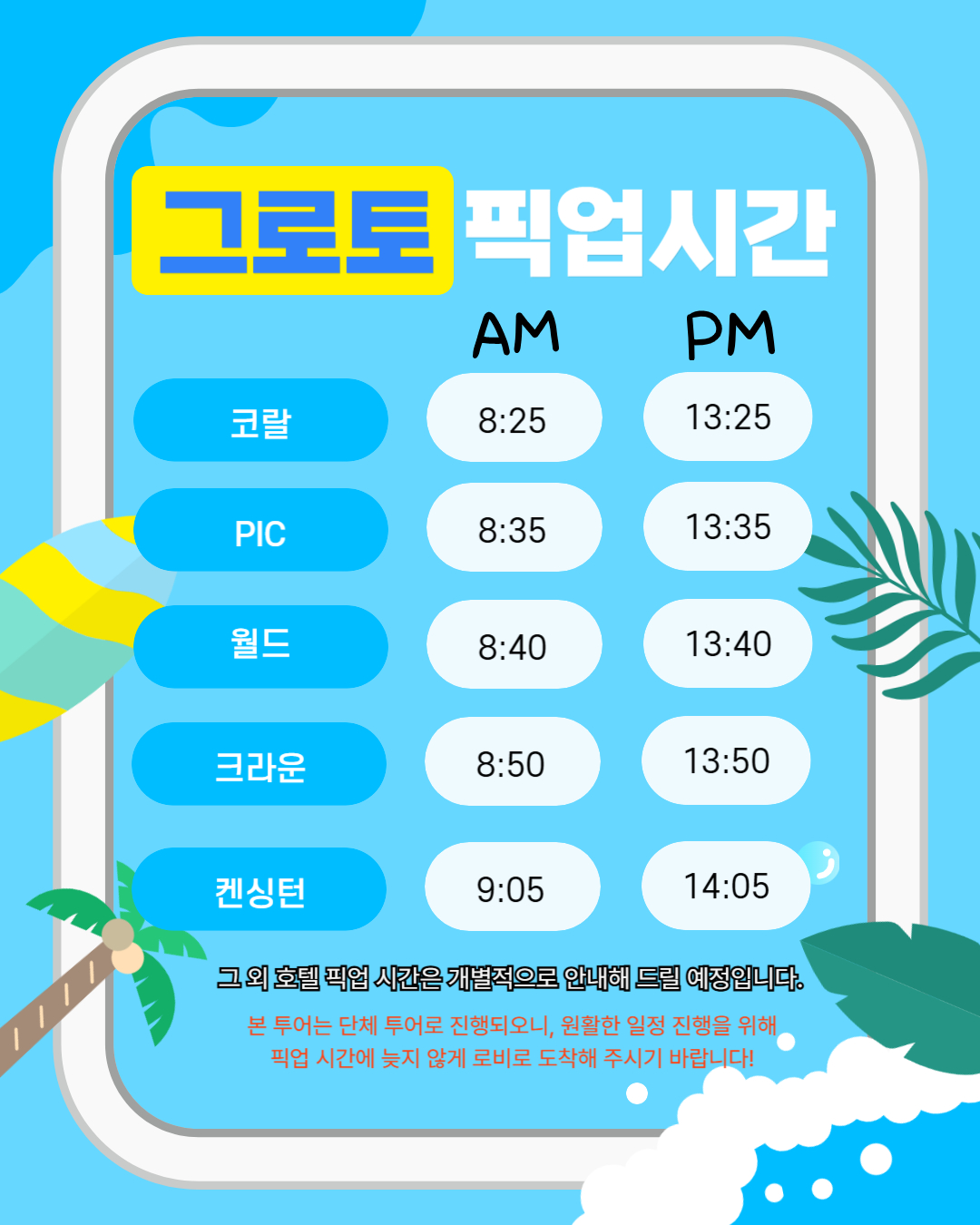 보통 9시 전후 픽업 해서 12시 전후 숙소 리턴 하게 됩니다. 오후도 2시 전후 픽업 5시 전후 리턴 합니다.