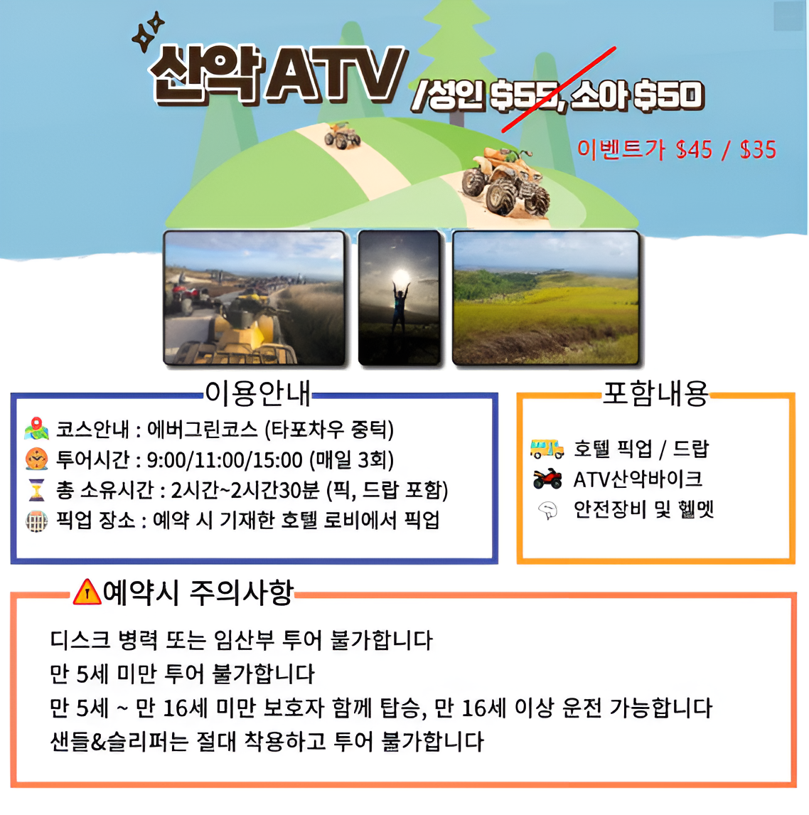 산악 ATV 45불 소아 35불 (타포차우산아래 에버그린코스)