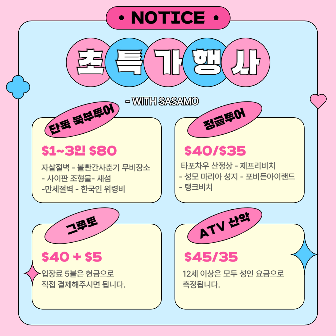 북부 투어 인당 30불 (단독 배차 _최소 인원 3명 이상)