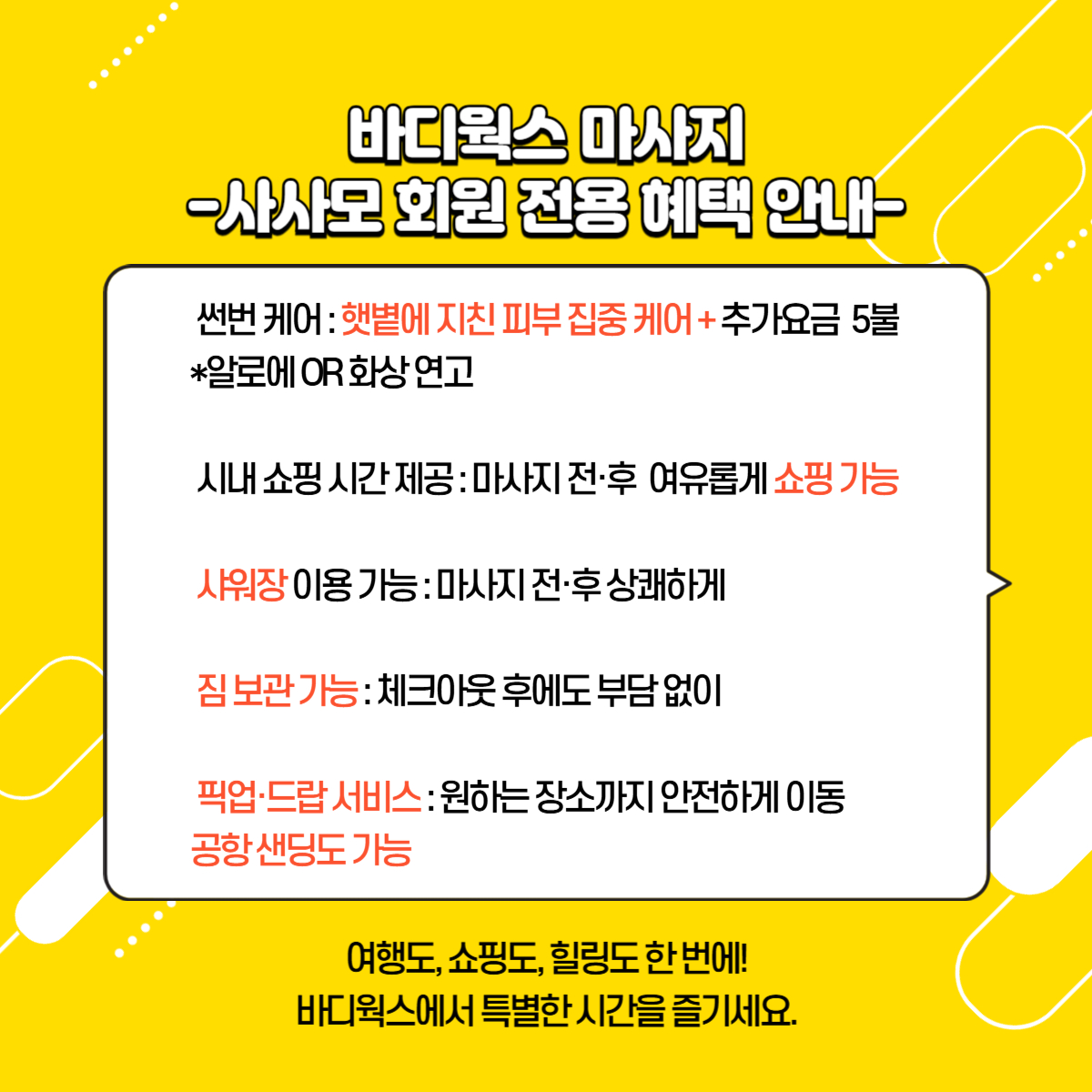 👉피로 해소 & 활력 증진: 여행 중에 쌓인 몸과 마음의 피로를 즉시 해소하여 남은 일정을 더욱 생기 넘치게 보내시거나, 여행의 마지막을 완벽한 편안함 속에서 마무리하실 수 있도록 도와드립니다.