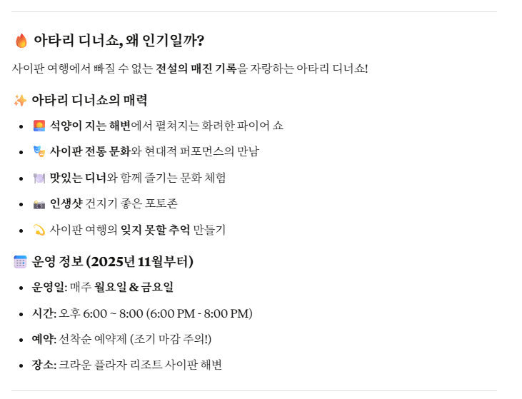 주말 여행을 계획하시는 분들께는 더 좋은 소식이네요. 금요일 저녁에 환상적인 디너쇼를 즐기고 주말을 맞이하는 것도 멋진 일정이 될 것 같습니다! 😊