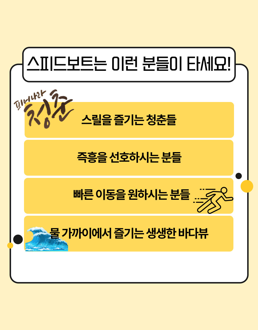 ⚠️ 스피드 보트는 정해진 시간에 출발이 어려울 수 있습니다. 부두에서 대기 하는 경우가 발생 할 수 있습니다.