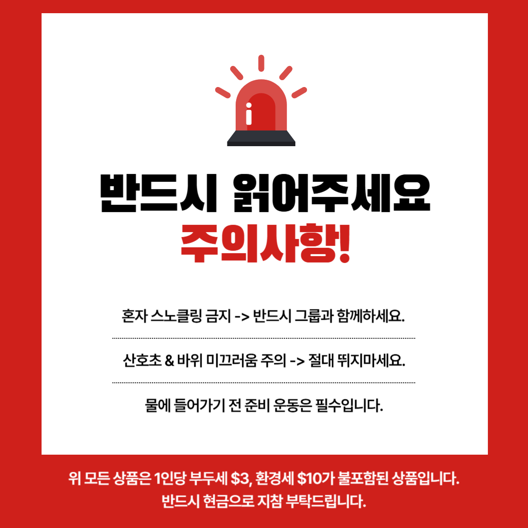 현재 섬에는 안전요원이 제한적으로 운영되고 있으며, 본 상품은 자유 투어 상품으로 가이드가 동반되지 않으니 안전에 각별히 주의해 주시기 바랍니다.
